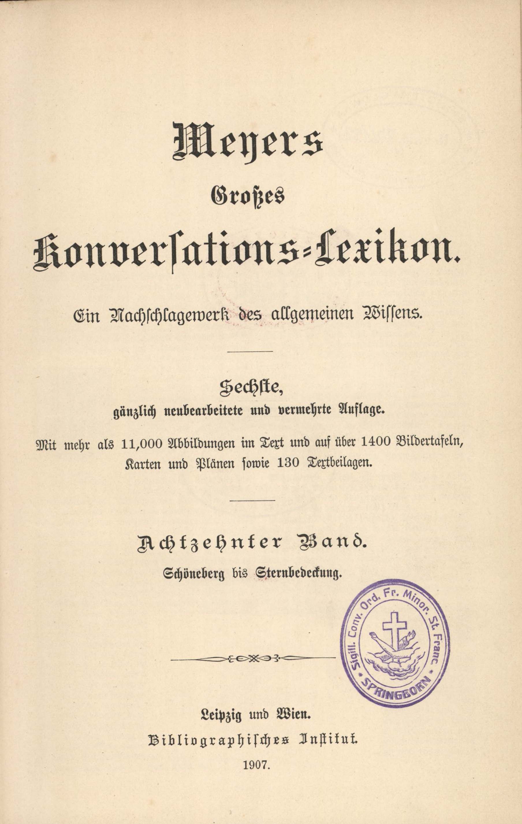Meyers Konversations : Lexikon : ein Nachschlagewerk des allgemeinen Wissens. T. 18, Schöneberg bis Sternbededung / Hermann Julius Meyer. - 6., gänzlich neubearb. Aufl. Neuer Abdruck. - Lipsk ; Wien. : Bibliographisches Institut, 1907. - [2], 950, [4] s., [74] tabl. : il., mapa kolor. ; 26 cm.