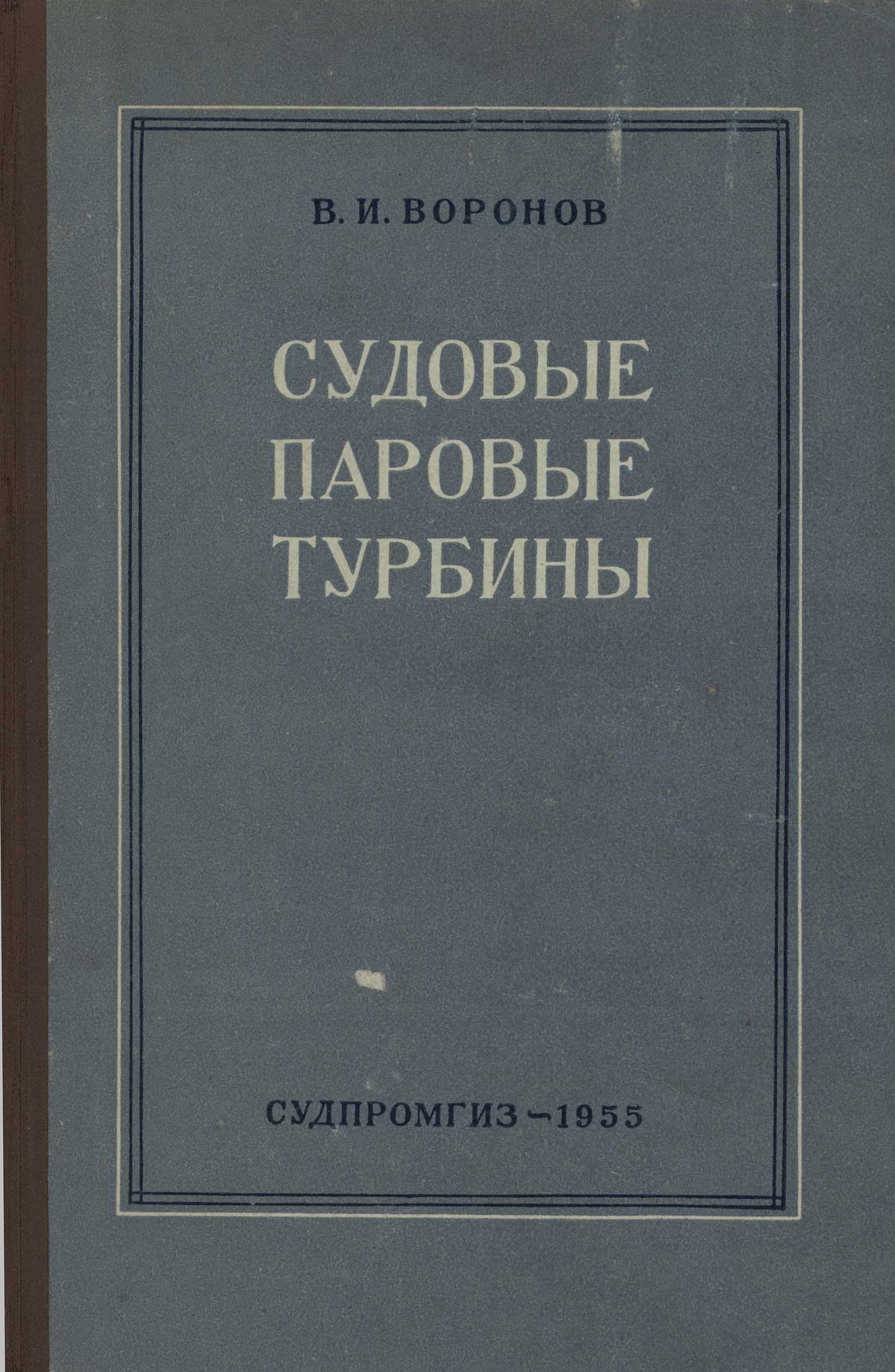Sudovye parovye turbiny / V.I. Voronov. - Leningrad : Gosudarstvennoe Soûznoe Izdatel'stvo Sudostroitel'noj Promyšlennosti, 1955. - 447, [1] s., [4] k. złoż. : rys., tab., schem. ; 23 cm.