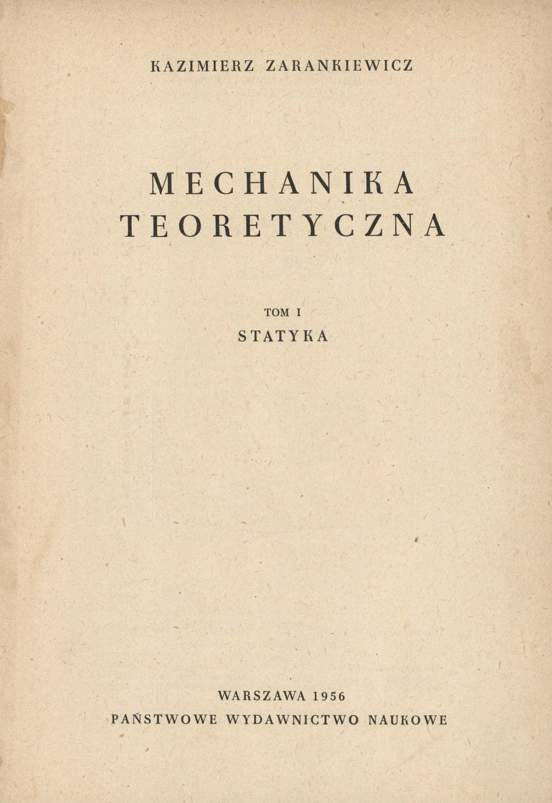 Mechanika teoretyczna. T.1. Statyka / Kazimierz Zarankiewicz. - Warszawa : PWN, 1956. - 186 s., [3] k. tabl. : il., rys. ; 24 cm.