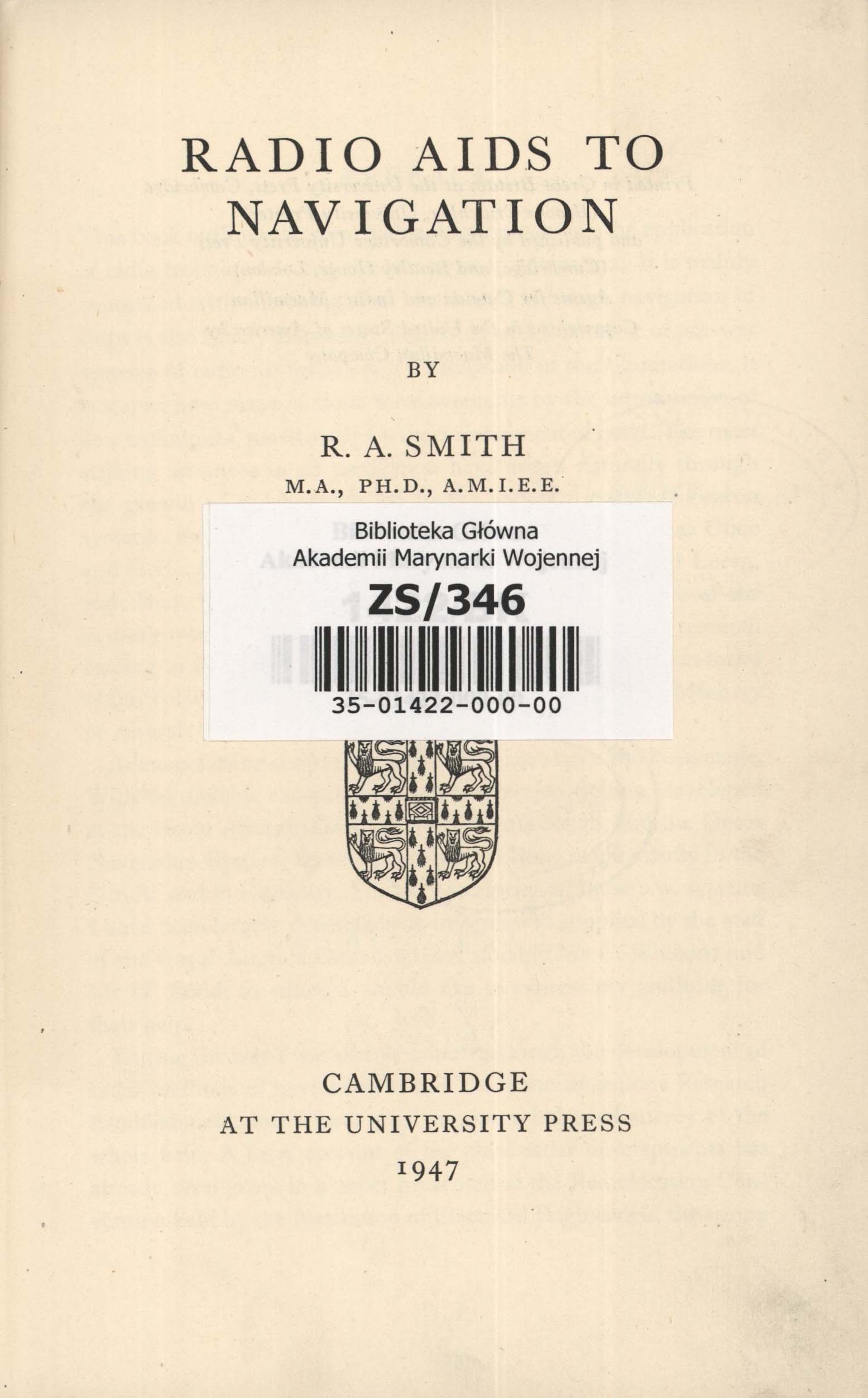 Radio aids to navigation / R.A. Smith. - Cambridge : Cambridge University Press, 1947. - XI, [1], 114 s., [7] k. il. : il., rys. ; 22 cm.