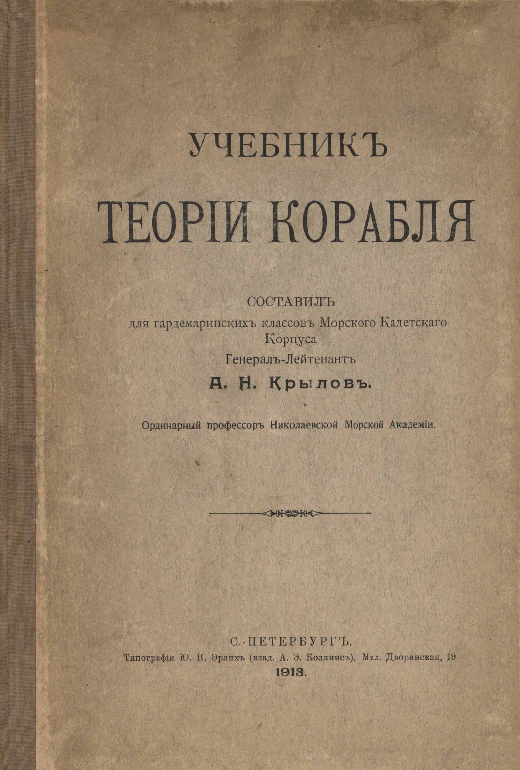 Učebnik teorii korablâ / sost. A.N. Krylov". - S.-Peterburg" : Tipografiâ Û.N. Erlih, 1913. - VI, 211, [2] k., [1] k. złoż. : il. ; 26 cm.