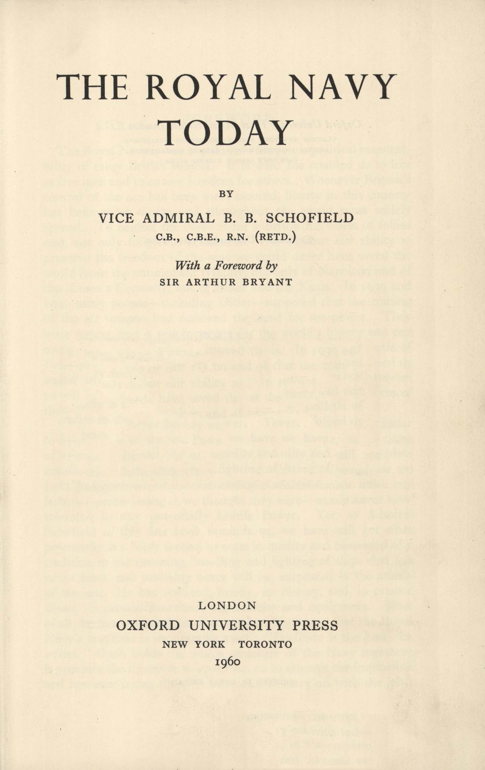 The Royal Navy today / by B.B. Schofield, with a foreword by Arthur Bryant. - London [etc.] : Oxford University Press, 1960. - XII, 163, [1] s., [17] s. il. : il., rys. ; 22 cm.