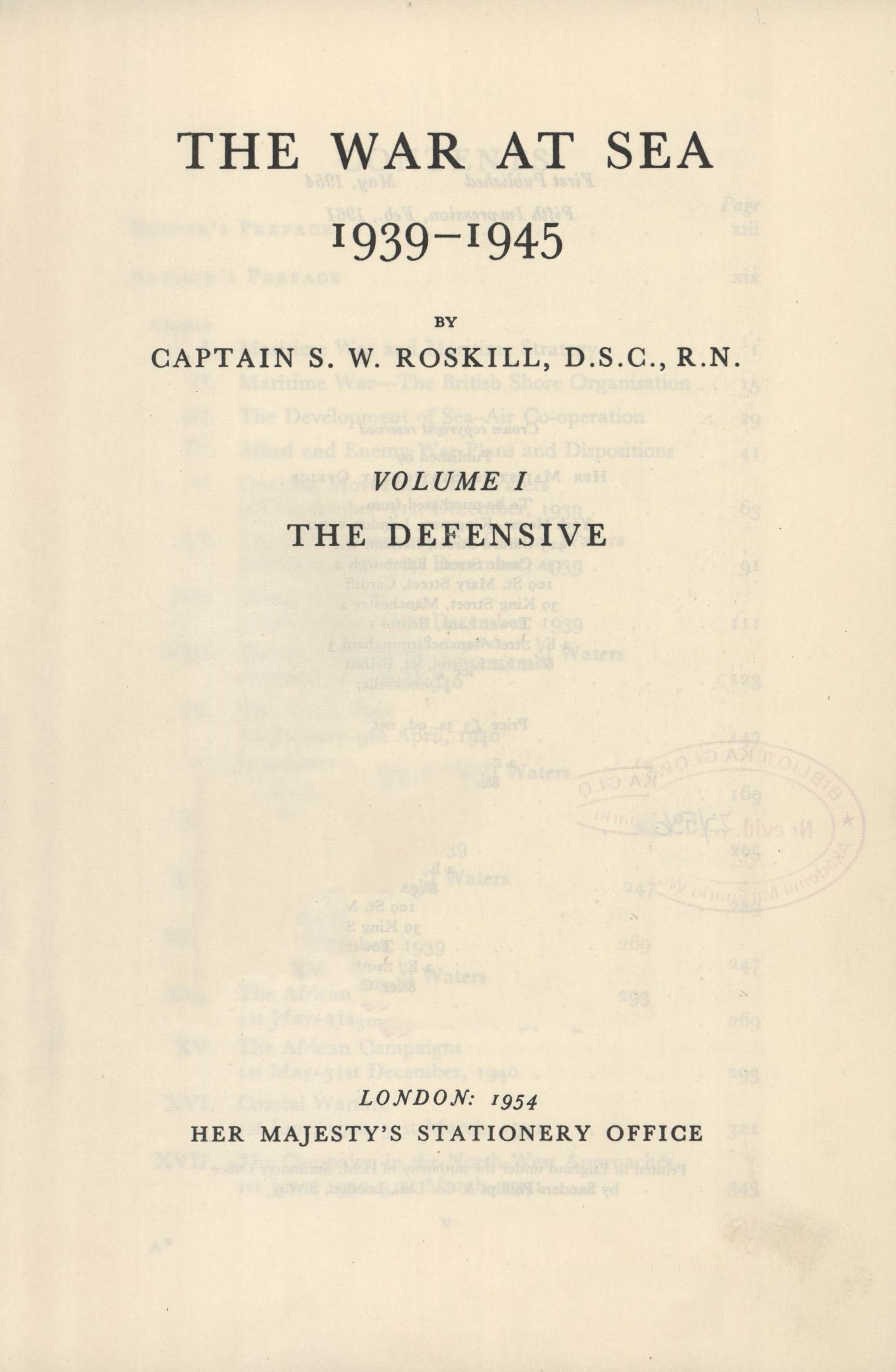 The war at sea : 1939-1945. Vol. 1, The defensive / by Stephen Wentworth Roskill. - London : Her Majesty's Stationery Office, 1954. - XXII, [2], 664 s., [40] s. tabl., [2] k . tabl., [36] k. tabl. złoż. : il. ; 25 cm.