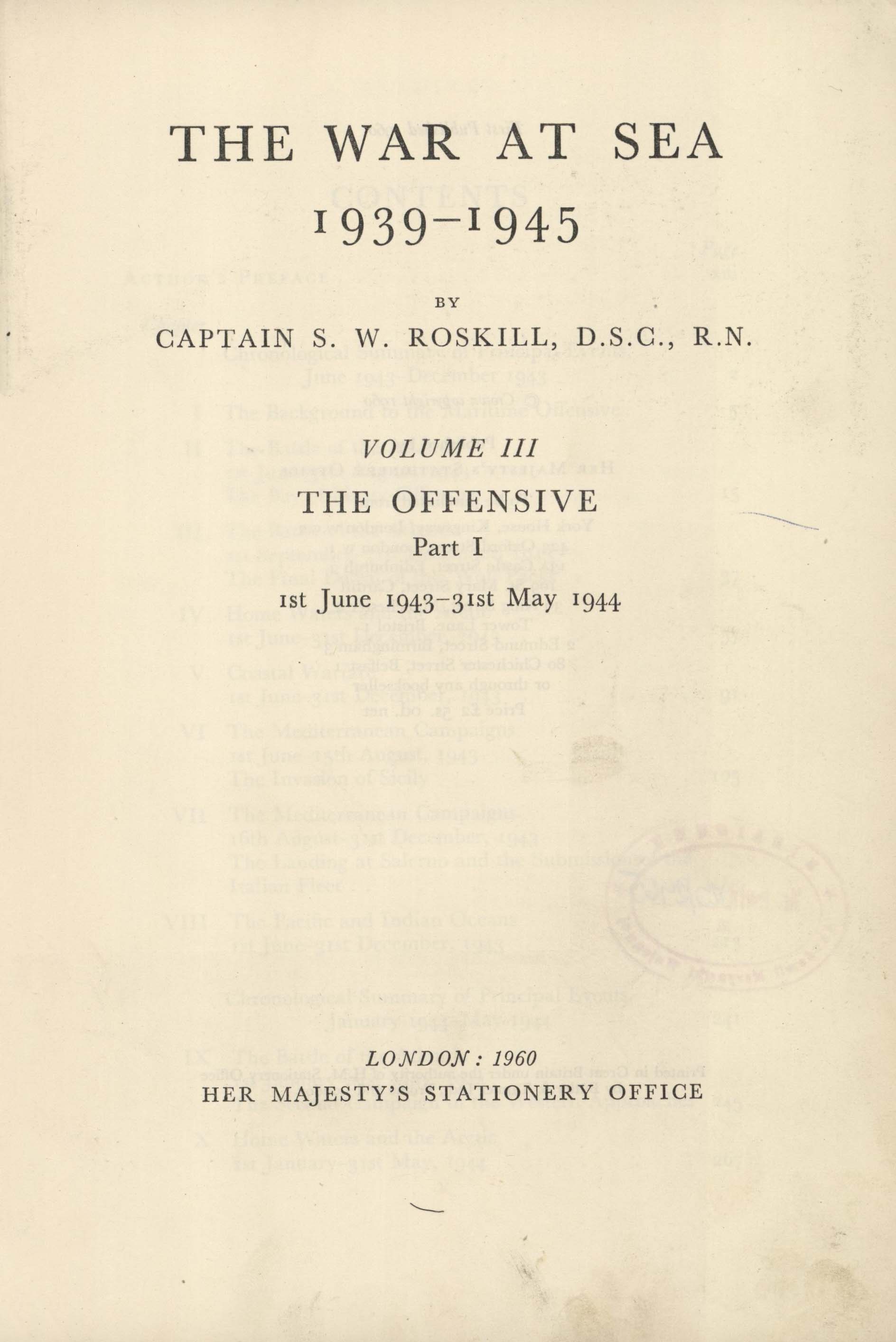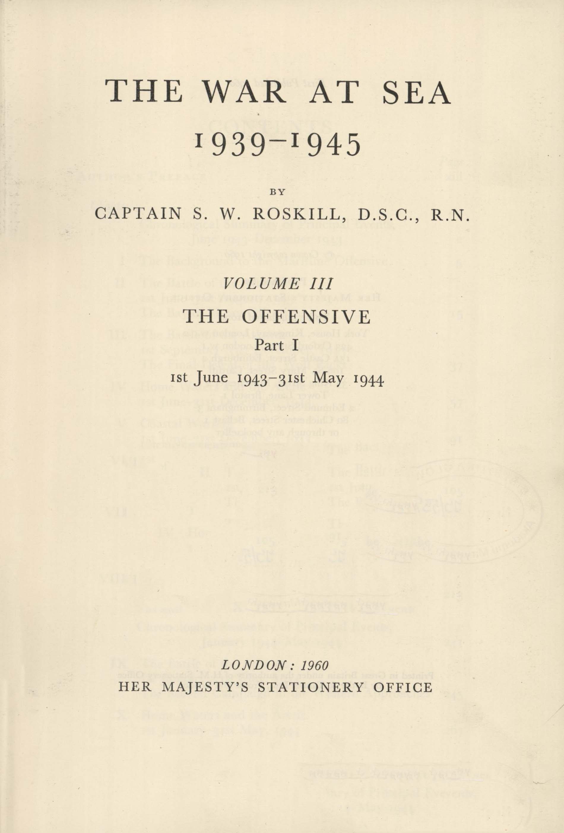The war at sea : 1939-1945. Vol. 3, The offensive. Pt.1. 1st June 1943 - 31st May 1944 / by S.W. Roskill. - London : Her Majesty's Stationery Office, 1960. - XV, [1], 413 s., [30] s. tabl., [14] k . tabl., [13] k. tabl. złoż. : il. ; 25 cm.