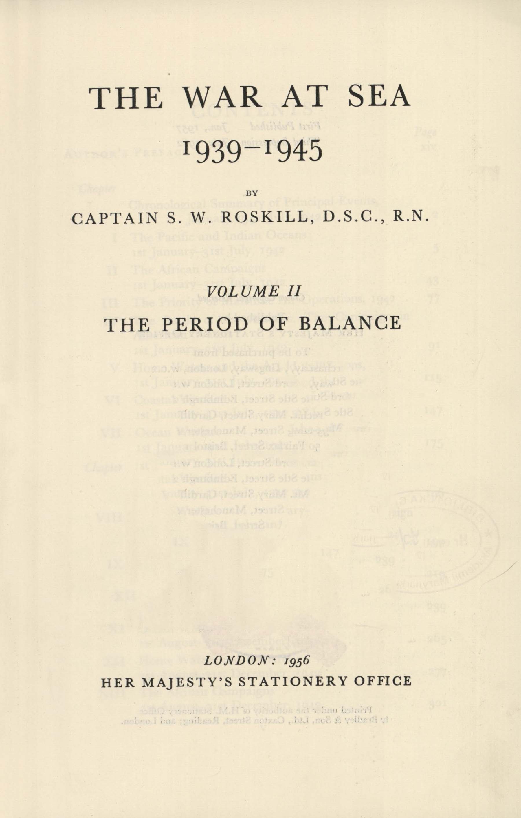 The war at sea : 1939-1945. Vol. 2, The period of balance / by S.W. Roskill. - London : Her Majesty's Stationery Office, 1956. - XVI, [2], 523 s., [32] s. tabl., [2] k . tabl., [36] k. tabl. złoż. : il. ; 25 cm.