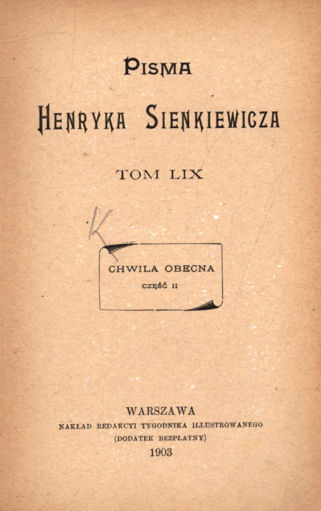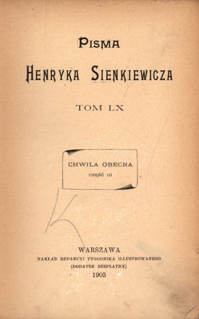 Chwila obecna. Cz. 3 / Henryk Sienkiewicz. - Warszawa : nakł. Redakcyi Tygodnika Illustrowanego, 1903 (Kraków : Druk W.L. Anczyca i S-ki). - 190 s. ; 19 cm.