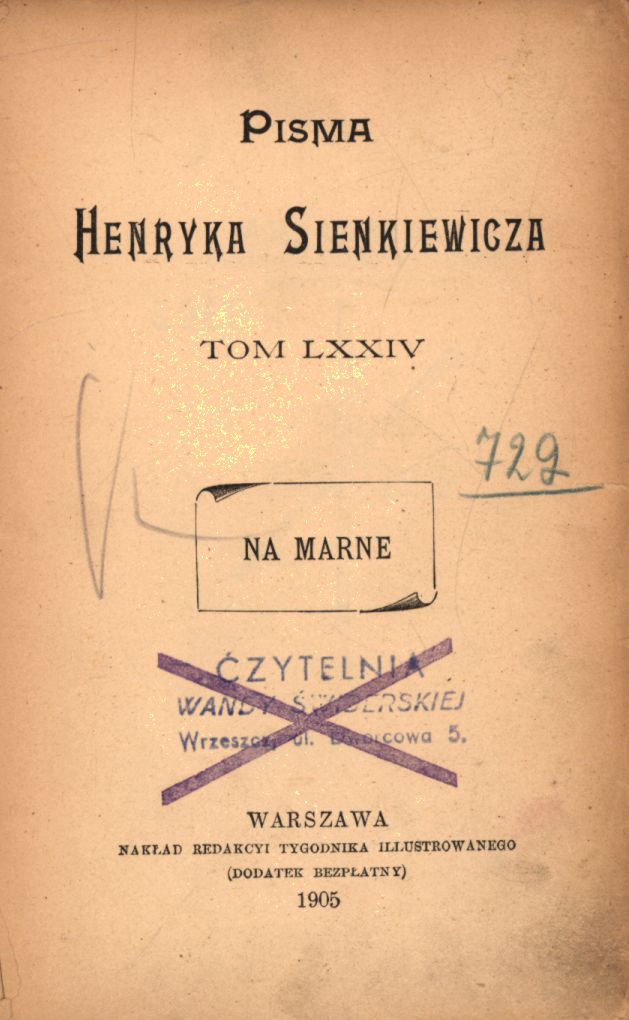 Na marne / Henryk Sienkiewicz. - Warszawa : Nakład Redakcyi Tygodnika Illustrowanego, 1905 (Kraków : dr. W. L. Anczyca i Spółki). - 202 s. ; 19 cm.