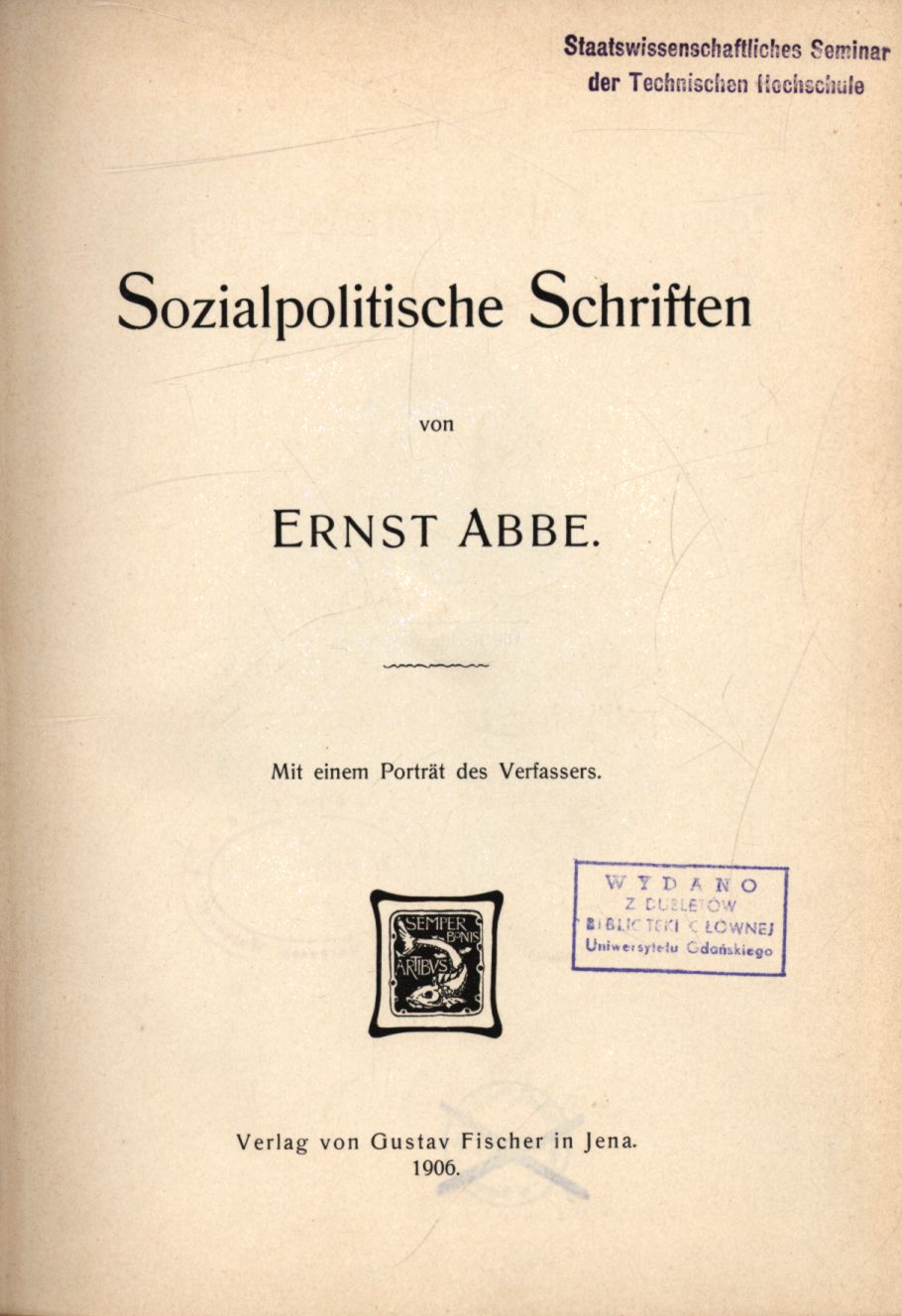 Sozialpolitische Schriften / von Ernst Abbe. - Jena : Verlag von Gustav Fischer, 1906. - XIII, [2], 402 s., [1] k. tabl. ; 24 cm.